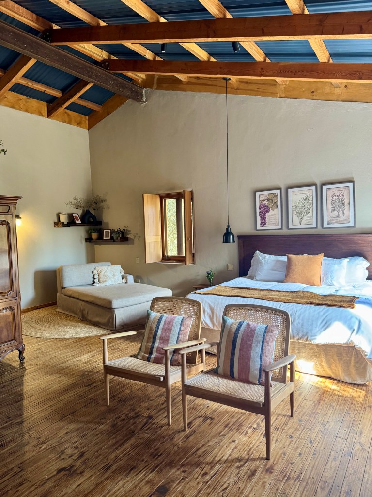 - Alma Liebre Vinedos del Valle – best for a large group who wants to cook or have a private meal at home. This is a property with 3 separate houses (6 person, 4 person and 2 person) and costs ~$5800 CAD for a 3-night weekend for all houses, or ~$700 CAD per night for the Deluxe Villa. You can also just rent the 4 person Deluxe Villa which has a great interior common area and full kitchen and add more bedrooms if you have more people. But you definitely need the Deluxe Villa to have an interior common area as the 6 bedroom house only has an outdoor area, which might be fine if you are visiting in the summer months. In the Deluxe Villa, there is also a single person day bed in each room so you could fit 3 people per room or a child on the day bed. This is only a 15 minute walk from Las Nubes winery.