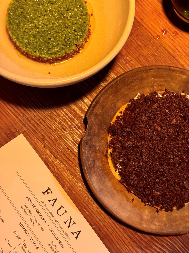 - Fauna – a great spot for dinner, located at Bruma winery and resort. Voted one of the top restaurants in Mexico. A reservation is a must. They have all shared tables and a rotating menu. They have delicious cocktails and the wines from Bruma are great too.